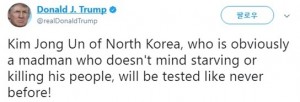 그러자 트럼프 대통령은 본인이 즐겨하는 트윗을 통해 “북한의 김정은은 인민들을 굶겨 죽이는 걸 꺼리지 않는 명백한 미치광이”라며 힐난했다. 그러면서 “그가(김정은이) 전례 없는 시험에 처하게 될 것”이라고 말했다.