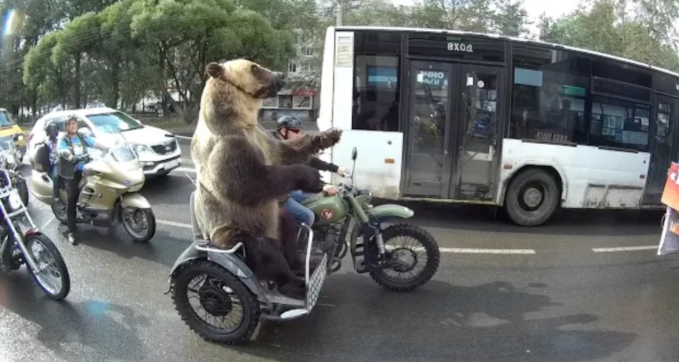 러시아 볼로그다 지역의 한 도로변에서 오토바이를 타는 곰의 영상이 화제다.