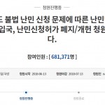‘제주도 예멘 난민’ 사태가 연일 사회적 이슈가 되고 있는 가운데, 대한민국의 난민 수용을 현 단계에서 반대한다는 청와대 국민청원이 마감(13일)까지 약 하루를 앞둔 12일 오전 11시경 참여자가 70만 명을 넘어섰다.