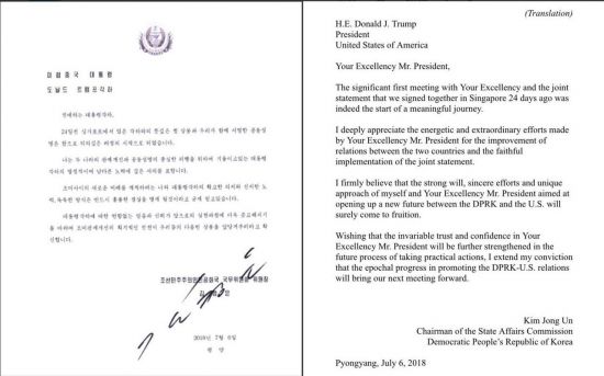 도널드 트럼프 미국 대통령이 북한 김정은 국무위원장으로부터 받은 친서를 공개했다. 한글과 영문 각각 1장으로 된 친서에서 김 위원장은 지난 6.12 싱가포르 공동성명은 의의 깊은 여정의 시작이었다고 말문을 열었다. 이어 두 나라의 관계개선과 공동성명 이행을 위한 트럼프 대통령의 남다른 노력에 깊은 사의를 표한다고 했다. 또, 자신과 트럼프 대통령의 확고한 의지...