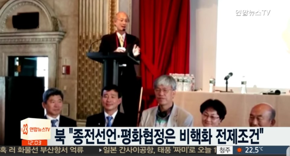 29일(현지시간) 미국 뉴욕 컴럼비아대학에서 열린 2018 국제 평화포럼에서 이기호 참사관이 태형철 김일성대 총장의 기조연설문을 대독하고 있다. 이미지=연합뉴스 영상 캡처