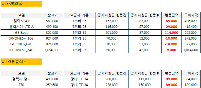 설 연휴에도 이동통신회사들이 공시보조금(지원금)을 또 하향 조정했다. 21일 휴대폰 오픈마켓 착한텔레콤에 따르면, 설 연휴 첫날인 2월 18일의 공시보조금 변동은 총 8건으로, SK텔레콤이 단말기 6종, LG유플러스가 단말기 2종의 공시보조금을 내렸다. SK텔레콤은 T끼리 35요금제 기준으로 G3비트 공시보조금을 11만4000원이나 하향했고, 갤럭시A7와 갤럭...