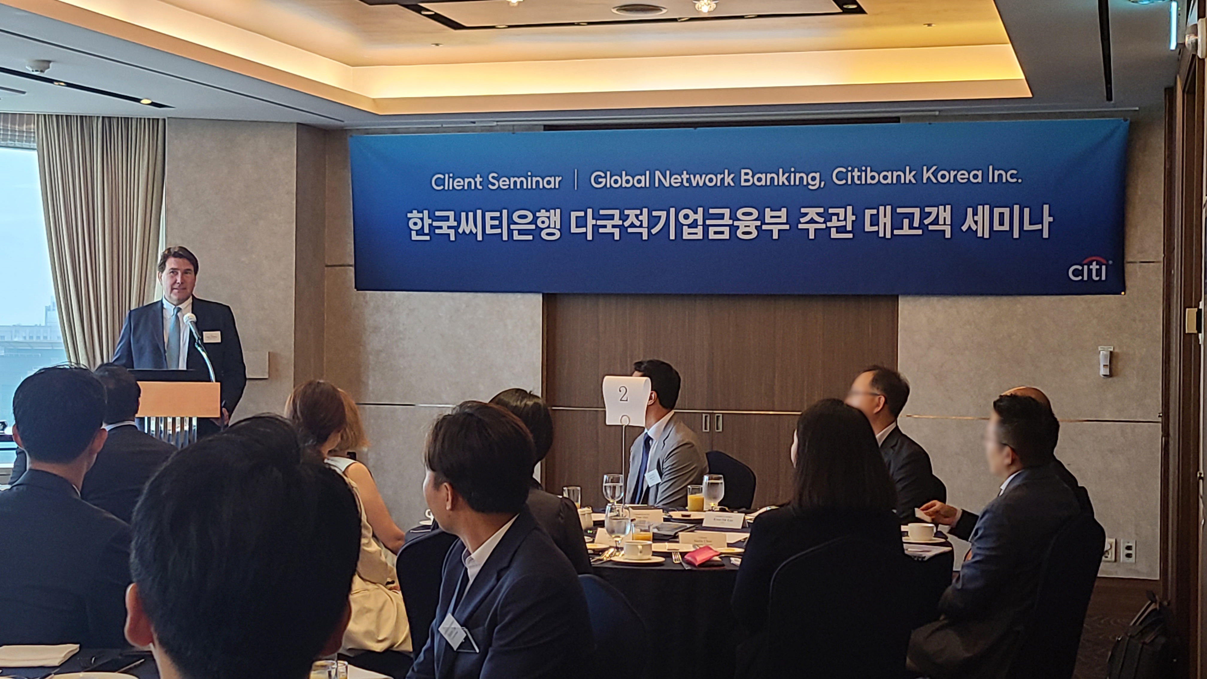 한국씨티은행(은행장 유명순)이 13일 오전 중구 소공동 롯데호텔 서울에서 20여명의 주요 다국적기업 최고경영자(CEO) 및 최고재무관리자(CFO)를 초청해 ‘경제 전망 세미나’를 개최했다. 이번 세미나는 씨티은행의 글로벌 네트워크와 구조화된 금융 솔루션을 통해 다국적기업 고객의 비즈니스 확장에 도움을 주고자 기획됐다. 이날 세미나에서는 씨티그룹의 글로벌 다국적...