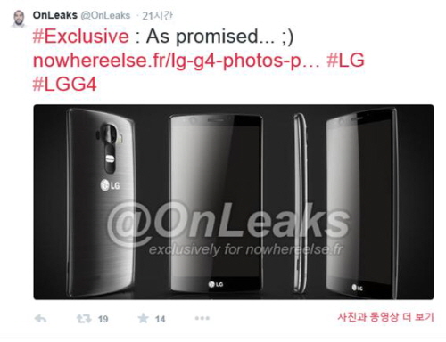 LG전자의 차기 전략 스마트폰 ‘G4’로 추정되는 스마트폰의 렌더링 이미지가 유출됐다. 전작 ‘G3’처럼 5.5인치 화면을 유지하되 크기가 다소 커지고 두께도 1mm정도 두꺼워진다는 소속이다. ‘G플렉스 2’처럼 휘어 있는 모습도 눈에 띈다. 지난 9일(이하 현지시간) 트위터 계정을 통해 LG G...