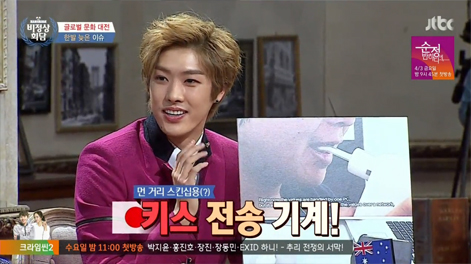 [출처=JTBC 화면 캡처] 30일 JTBC ‘비정상회담’의 ‘글로벌 문화대전-한발 늦은 이슈’에서 일본 대표 타쿠야가 장거리 연애를 위한 일본의 발명품인 ‘키스 전송 기계’를 소개했다. 빨대를 물고 혀 움직임을 전달하면 기억해서 인터넷을 통해 상대방에게 전송하는 기계이다. 빨대가 양쪽에 하나씩 ...